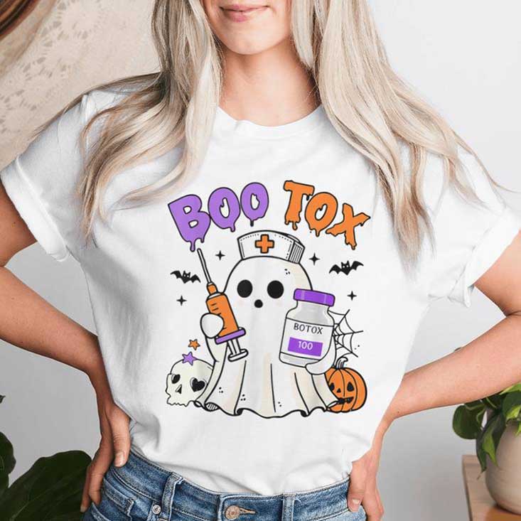 Boo Tox Nurse Ghost Filler Botox Halloween Aesthetic Nurse T-shirt available sizes for toddler and youth and adult men and women and availabe for Classic T-shirt, V-neck T-shirt, Tank Top, Hoodie, Sweatshirt.