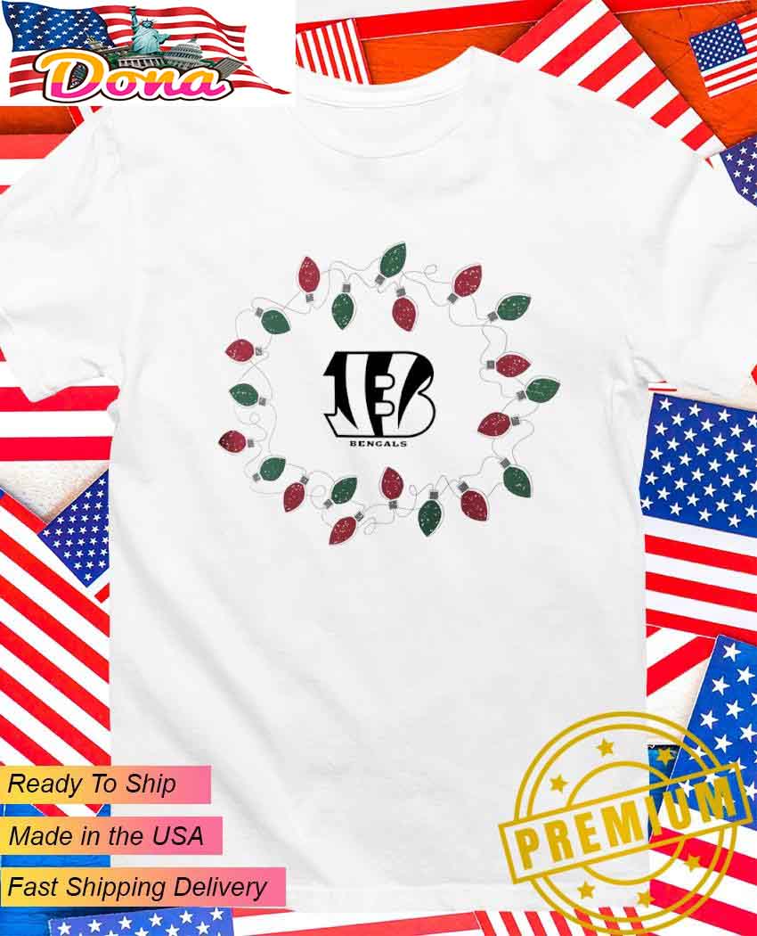 Christmas Lights around Cincinnati Bengals T-Shirt available sizes for youth and adult men and women and availabe for Classic T-shirt, V-neck T-shirt, Tank Top, Hoodie, Sweatshirt.