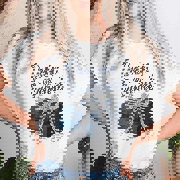 Denim And Diamonds Bow Ladies Girls Western Glam T-shirt