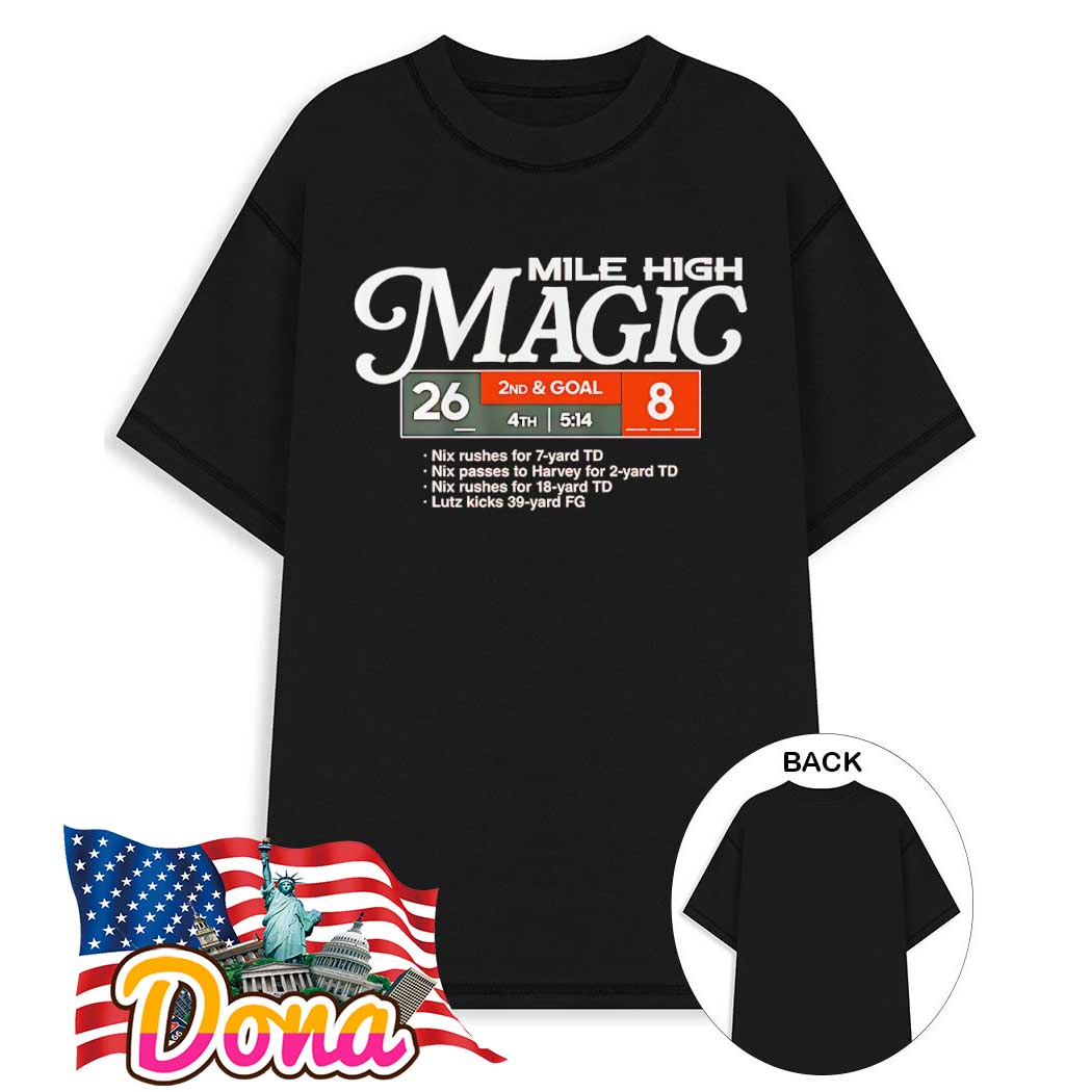 Denver Broncos Football Mile High Magic 26-8 T-Shirt available sizes for toddler and youth and adult men and women and availabe for Classic T-shirt, V-neck T-shirt, Tank Top, Hoodie, Sweatshirt.