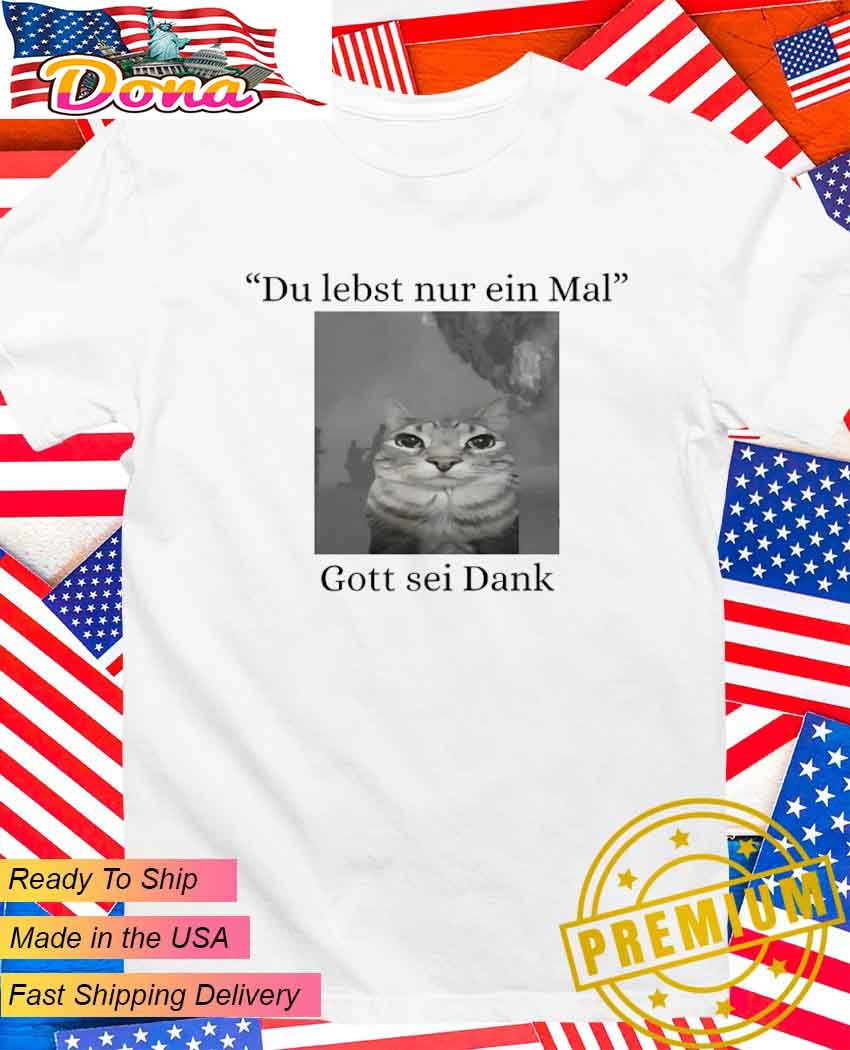 Du lebst nur ein Mal Gott sei Dank cat meme T-Shirt available sizes for youth and adult men and women and availabe for Classic T-shirt, V-neck T-shirt, Tank Top, Hoodie, Sweatshirt.