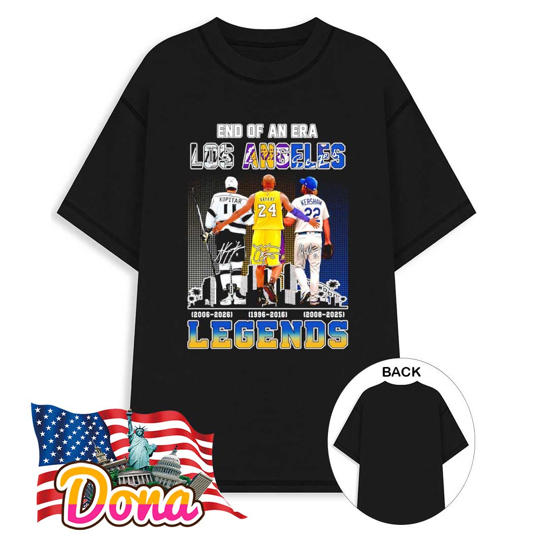 End of an Era Los Angeles Legends Kopitar Bryant and Kerchaw skyline signature T-Shirt available sizes for toddler and youth and adult men and women and availabe for Classic T-shirt, V-neck T-shirt, Tank Top, Hoodie, Sweatshirt.