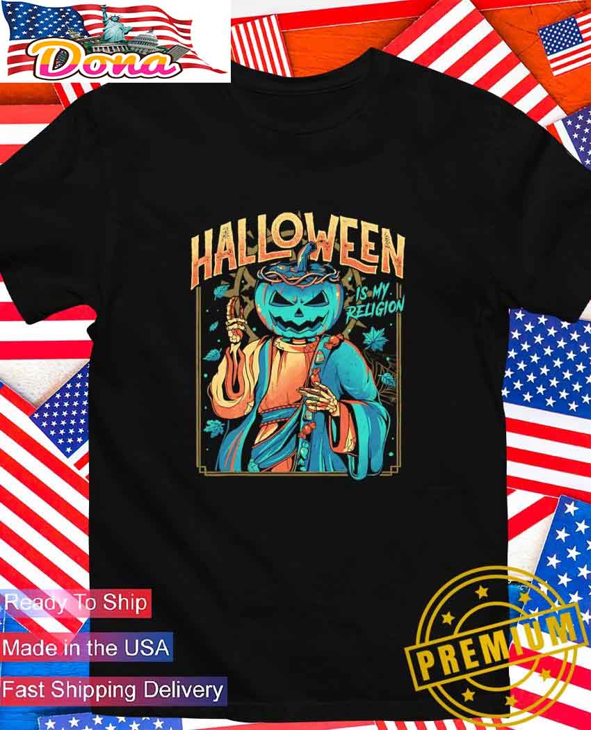 Halloween is my religion pumpkin T-Shirt available sizes for youth and adult men and women and availabe for Classic T-shirt, V-neck T-shirt, Tank Top, Hoodie, Sweatshirt.
