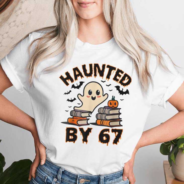 Haunted By 67 Teacher Ghost Pumpkin Halloween Costume T-shirt available sizes for toddler and youth and adult men and women and availabe for Classic T-shirt, V-neck T-shirt, Tank Top, Hoodie, Sweatshirt.