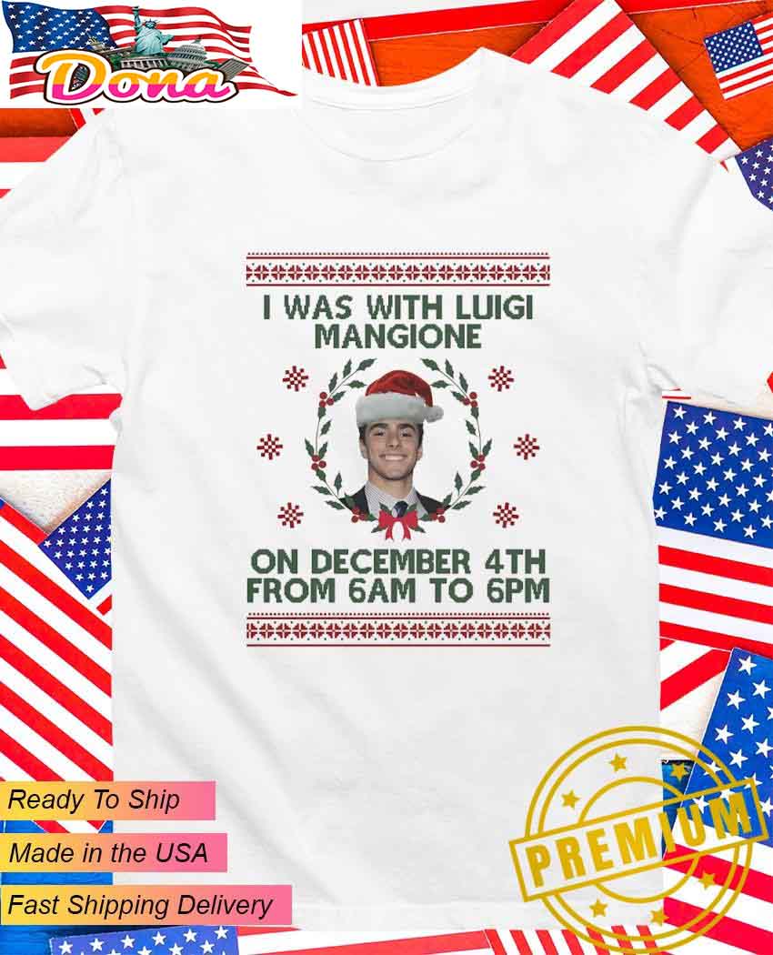 Check More Design I was with Luigi Mangione on December 4th from 6am to 6pm Christmas Shirt High Quality Design. Inspirational designs, illustrations, and graphic elements. Availabe for T-shirt, V-neck T-shirt, Tank Top, Hoodie, Sweatshirt