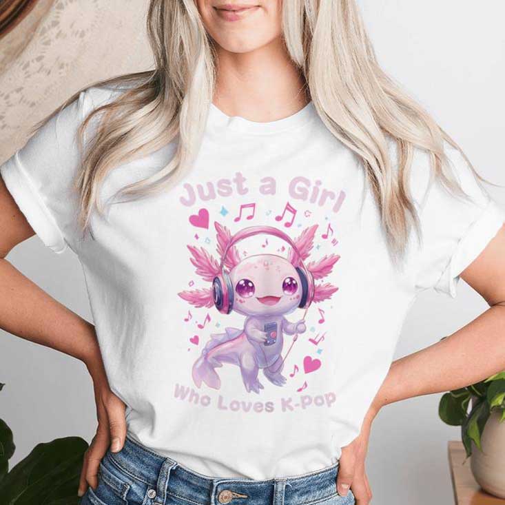 Just A Girl Who Loves K-Pop Cute Axolotl Music Lover Anime T-shirt available sizes for toddler and youth and adult men and women and availabe for Classic T-shirt, V-neck T-shirt, Tank Top, Hoodie, Sweatshirt.