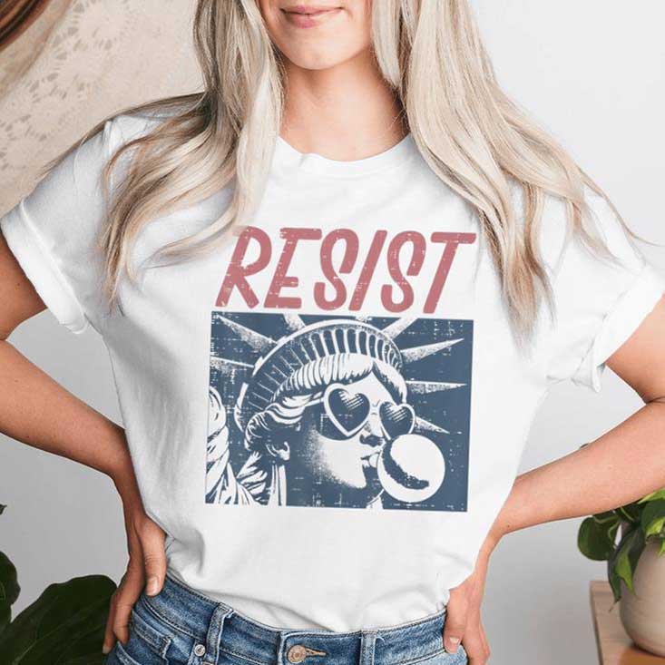 Resist Statue Liberty Bubblegum Protest Equality T-shirt available sizes for toddler and youth and adult men and women and availabe for Classic T-shirt, V-neck T-shirt, Tank Top, Hoodie, Sweatshirt.