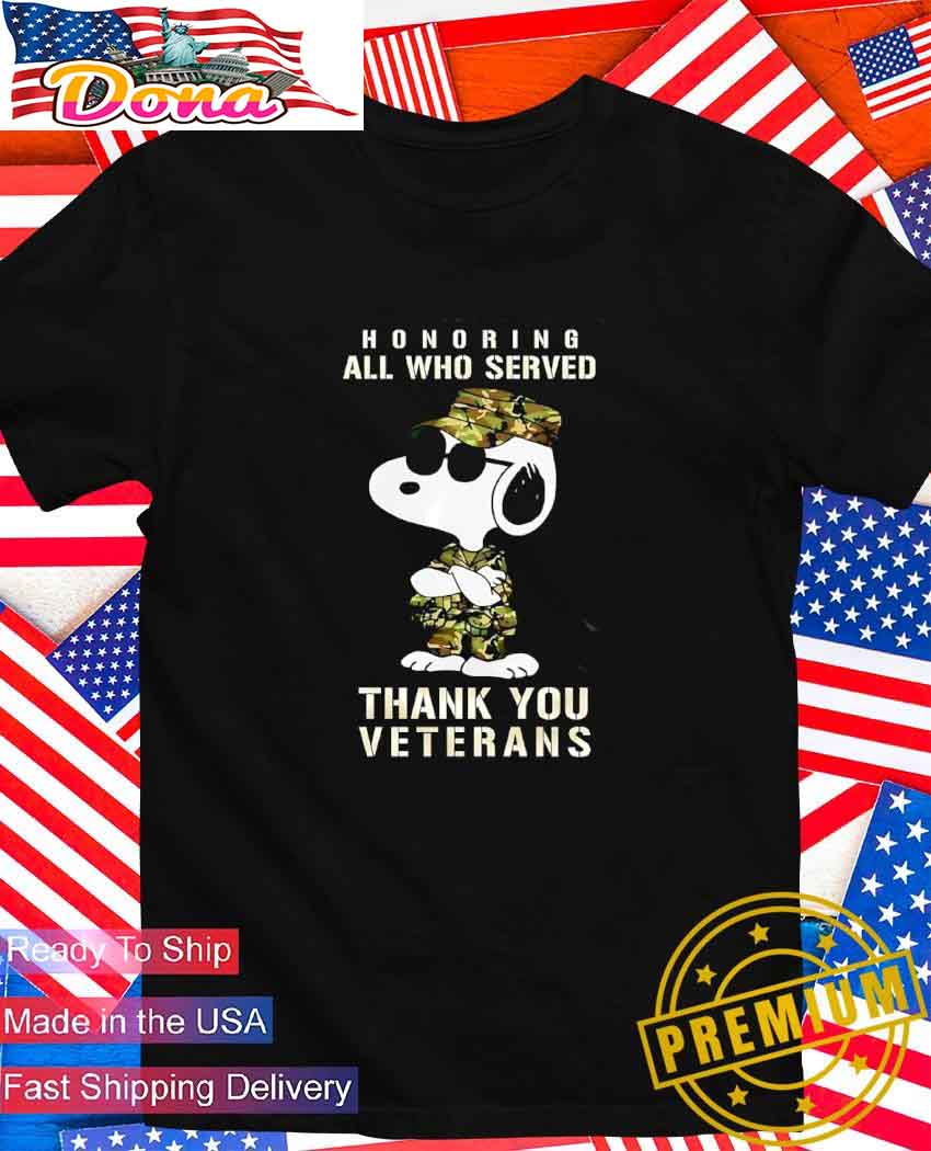 Snoopy honoring all who served thank you veterans T-Shirt available sizes for youth and adult men and women and availabe for Classic T-shirt, V-neck T-shirt, Tank Top, Hoodie, Sweatshirt.