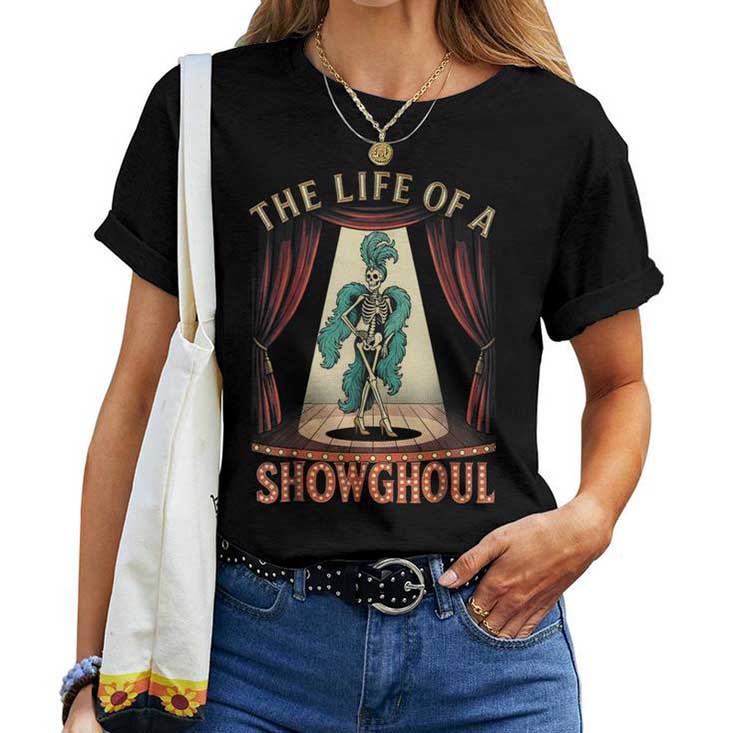 The Life Of A Showghoul Halloween Show Skeleton Girl Retro T-shirt available sizes for toddler and youth and adult men and women and availabe for Classic T-shirt, V-neck T-shirt, Tank Top, Hoodie, Sweatshirt.